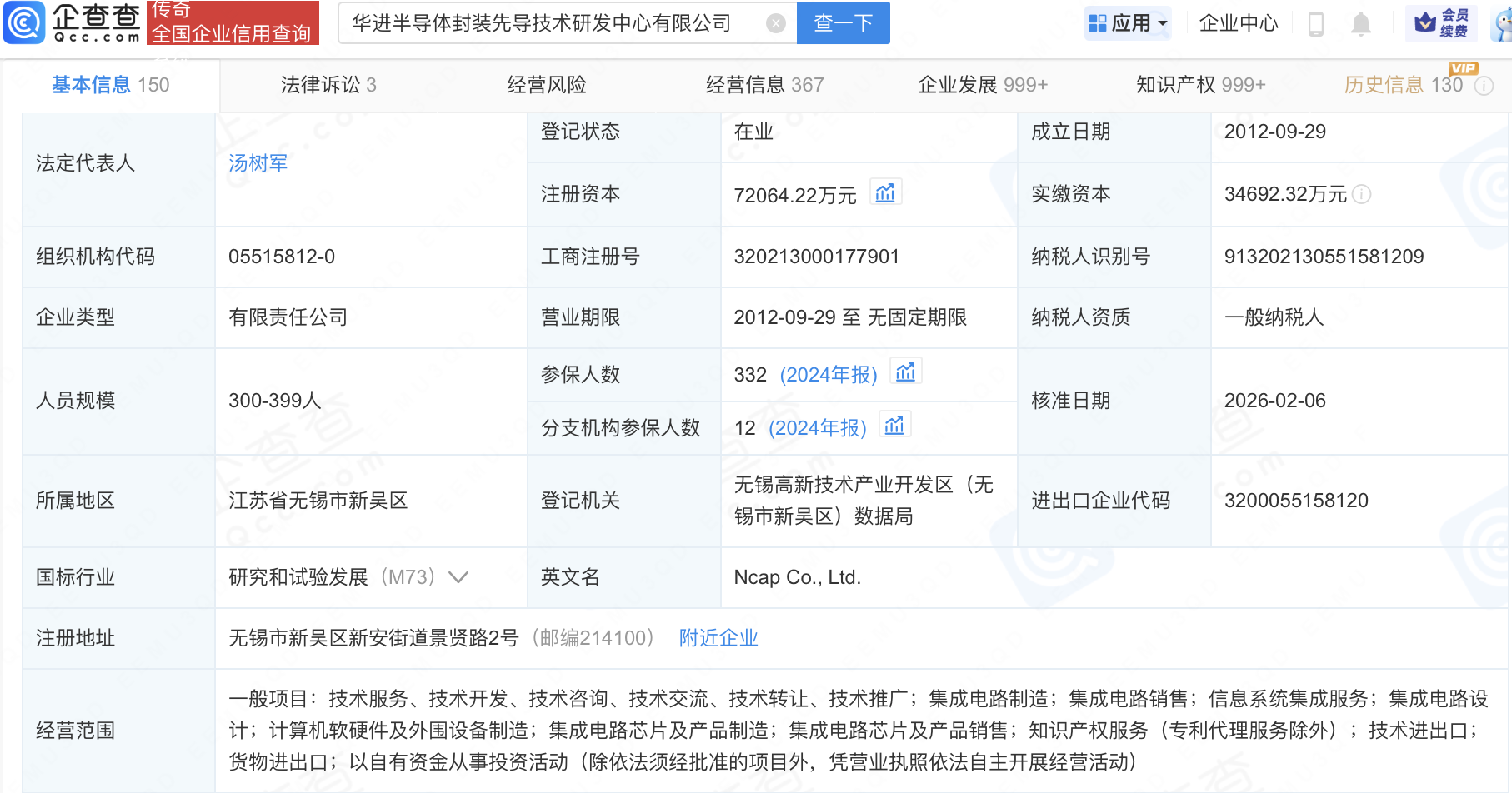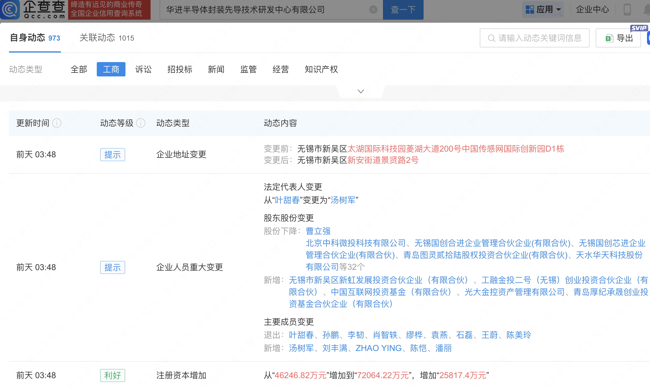 近日,华进半导体封装先导技术研发中心有限公司发生工商变更,新增中国互联网投资基金(有限合伙)等为股东,同时注册资本增至7.21亿元。企查查信息显示,该公司成立于2012年,法定代表人为汤树军,经营范围包含:集成电路设计;计算机软硬件及外围设备制造;集成电路芯片及产品制造;集成电路芯片及产品销售等。据其官网,华进半导体是一家半导体封测公司。