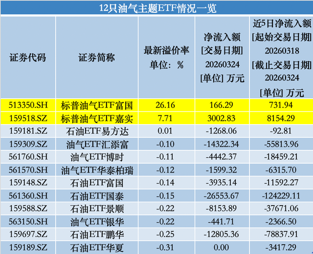 Wind数据显示,截至3月25日收盘,富国标普油气ETF的溢价率高达26.16%,周三成交额为23.07亿元。值得注意的是,近五个交易日,该基金仍持续呈现资金净流入态势,单日净流入额在129万元至166万元之间不等。